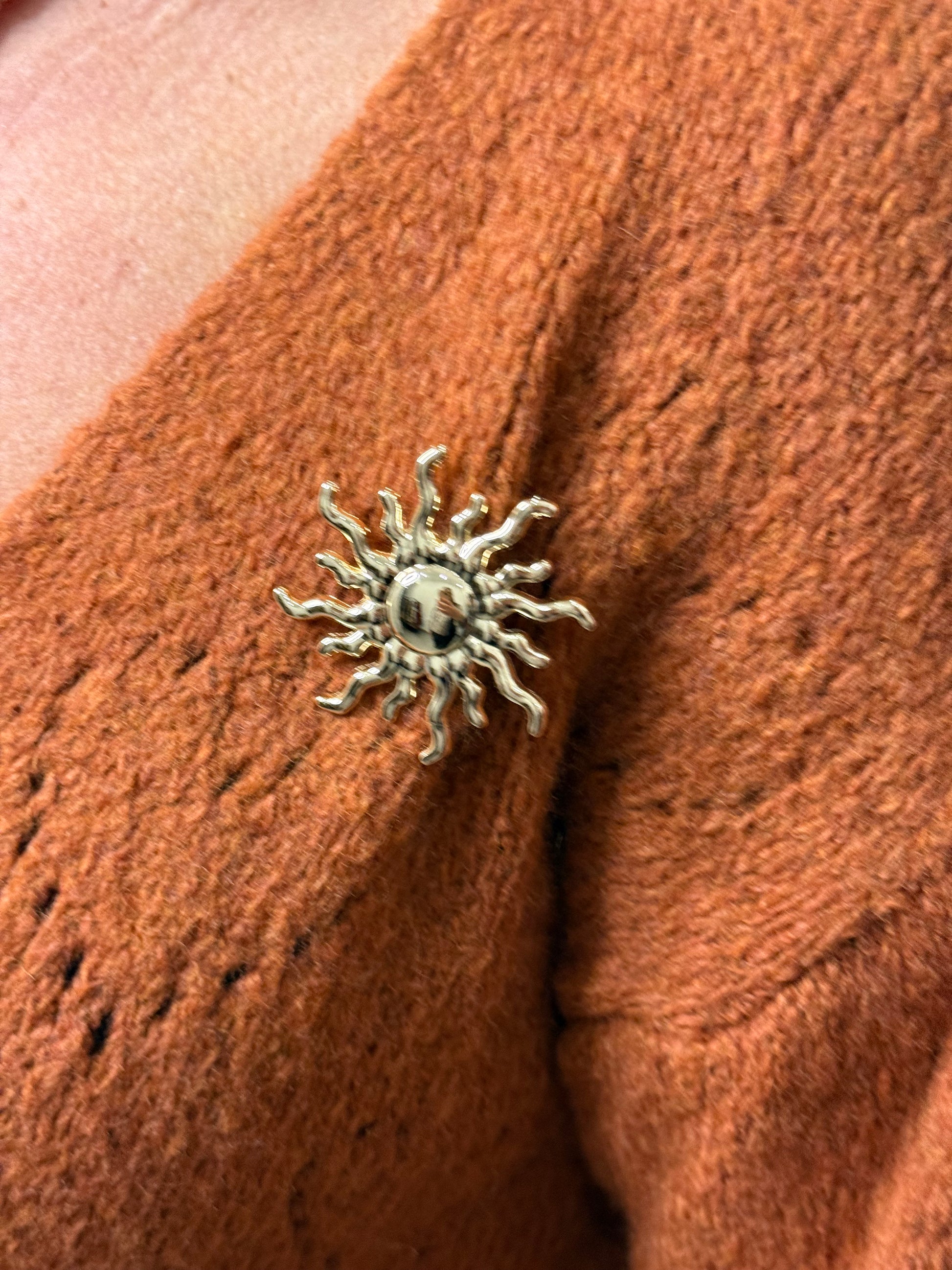 - La broche soleil dorĂ©, qui illumine et sublime le pull âïž