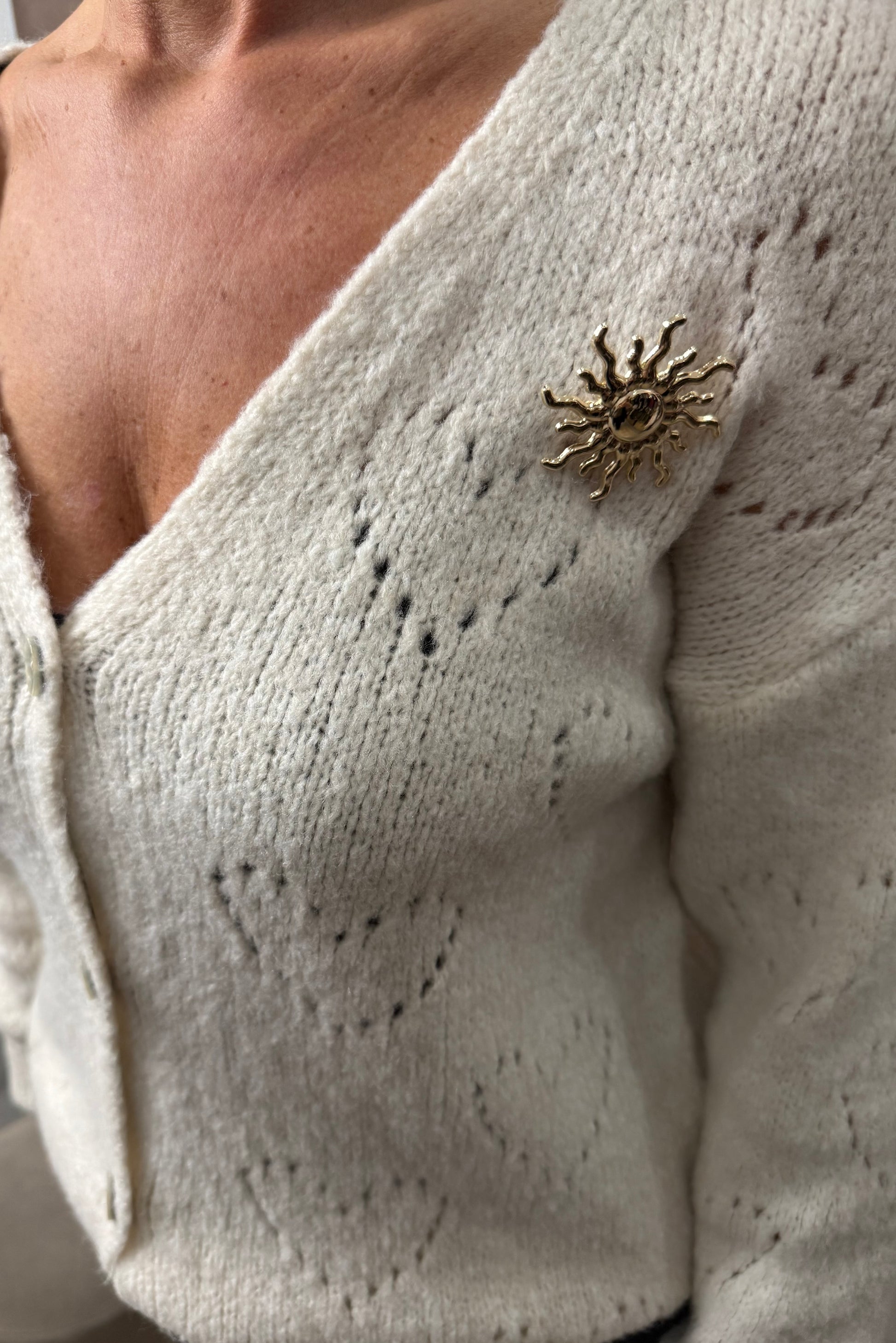 đ Gilet ajourĂ© cĆur avec broche soleil dorĂ© â Taille unique (36 au 48)