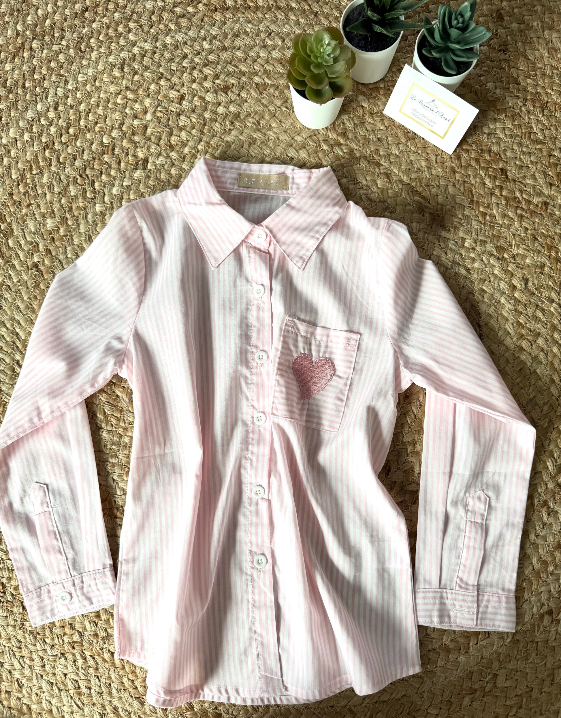 Détails : Chemise rasée délicate, rayée et de couleur rose, avec une petite poche ornée d’un cœur pour une touche charmante et féminine.