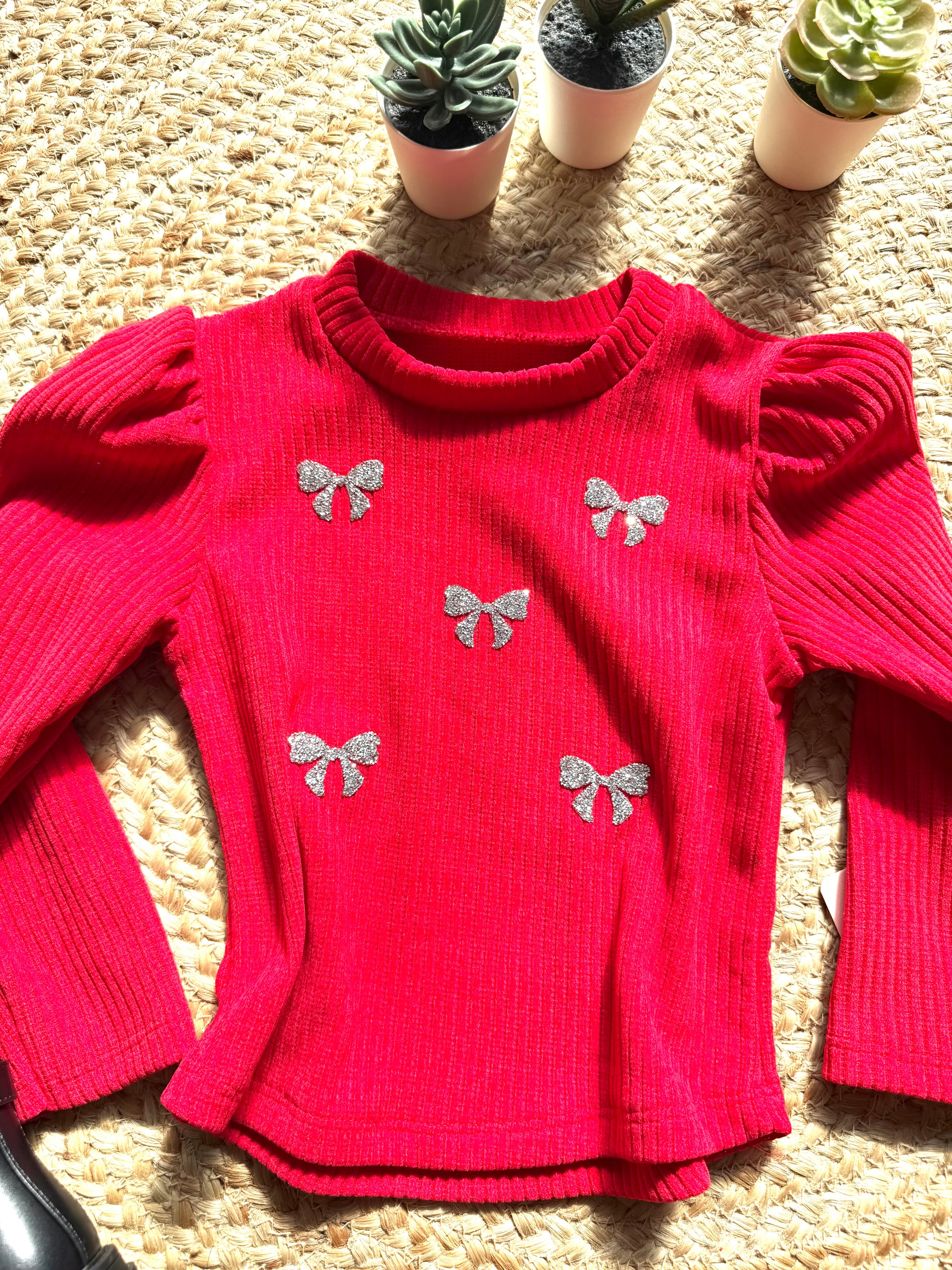 Un ensemble élégant et confortable composé d’un pull et d’une jupe-short rouge assortie. Le pull est décoré de jolis nœuds argentés pour une touche scintillante, tandis que la jupe-short possède une taille élastique, offrant liberté de mouvement et praticité.