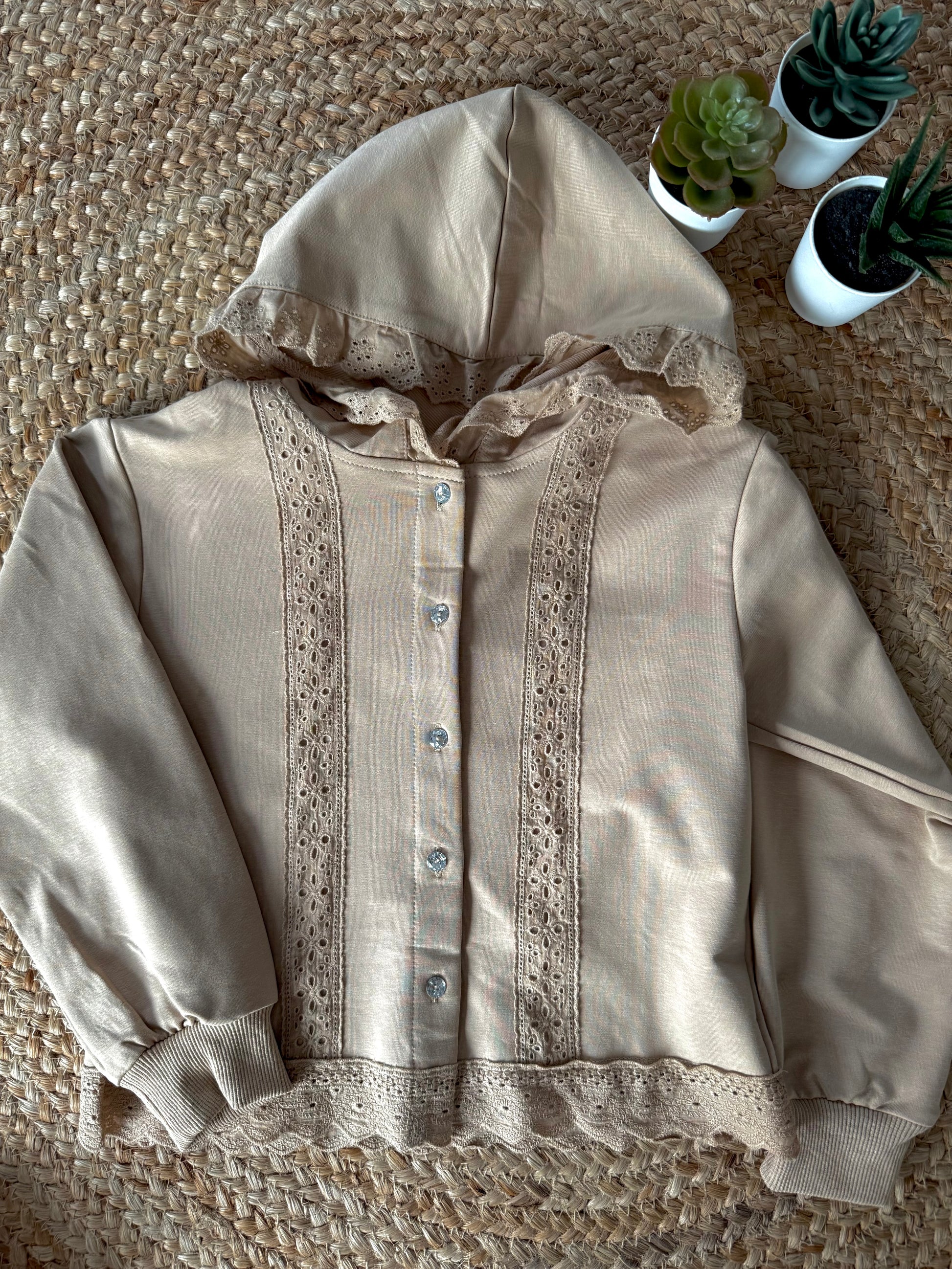 Détails : Gilet léger à capuche, orné de broderie anglaise pour une touche élégante et raffinée. Confortable et facile à porter au quotidien.