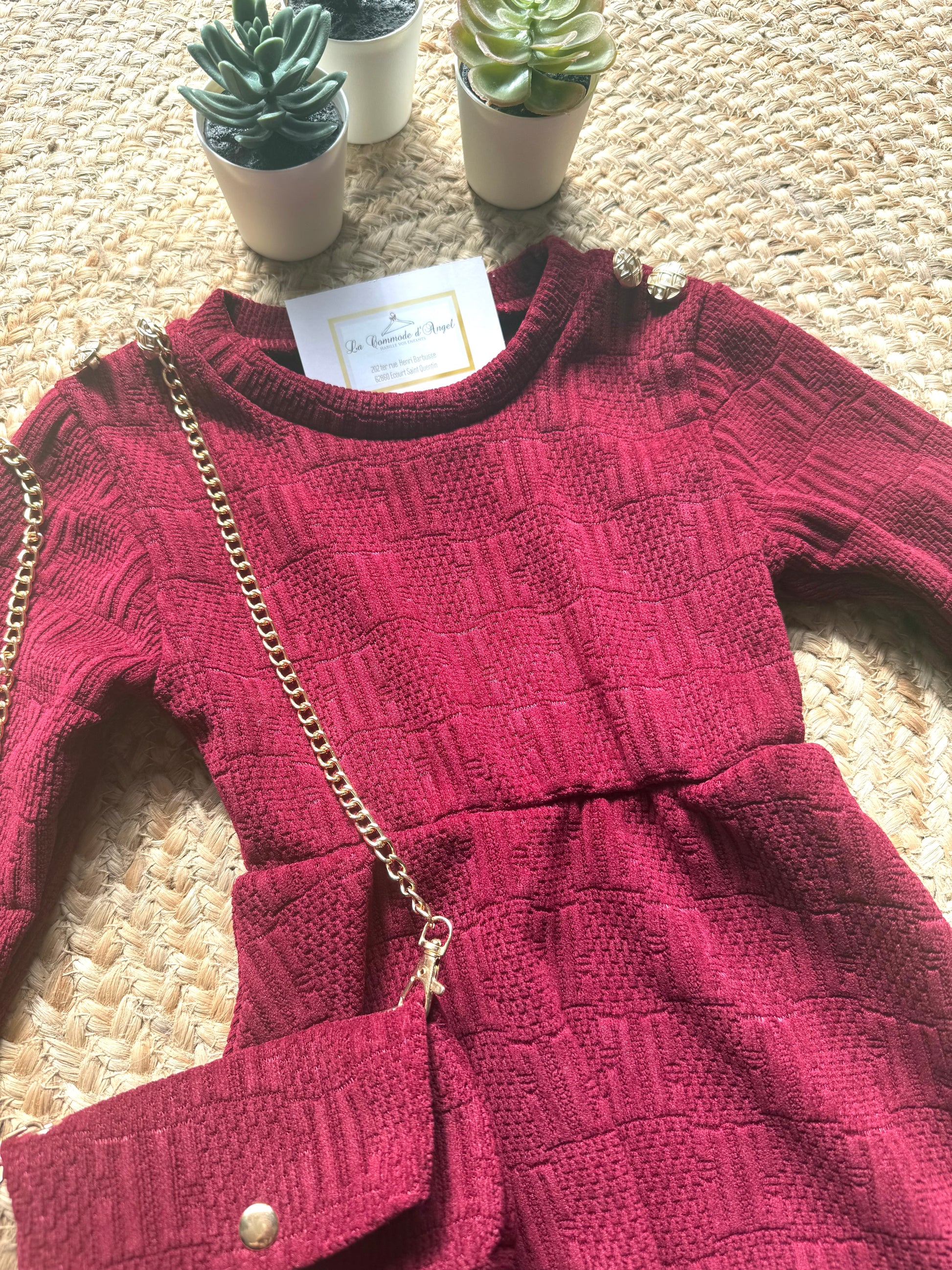 Cette jolie robe bordeaux séduit par son tissu imprimé et ses détails raffinés. Elle est accompagnée de son sac assorti et décorée de boutons aux épaules pour une touche élégante. Sa taille élastiquée assure confort et maintien tout en mettant la silhouette en valeur.