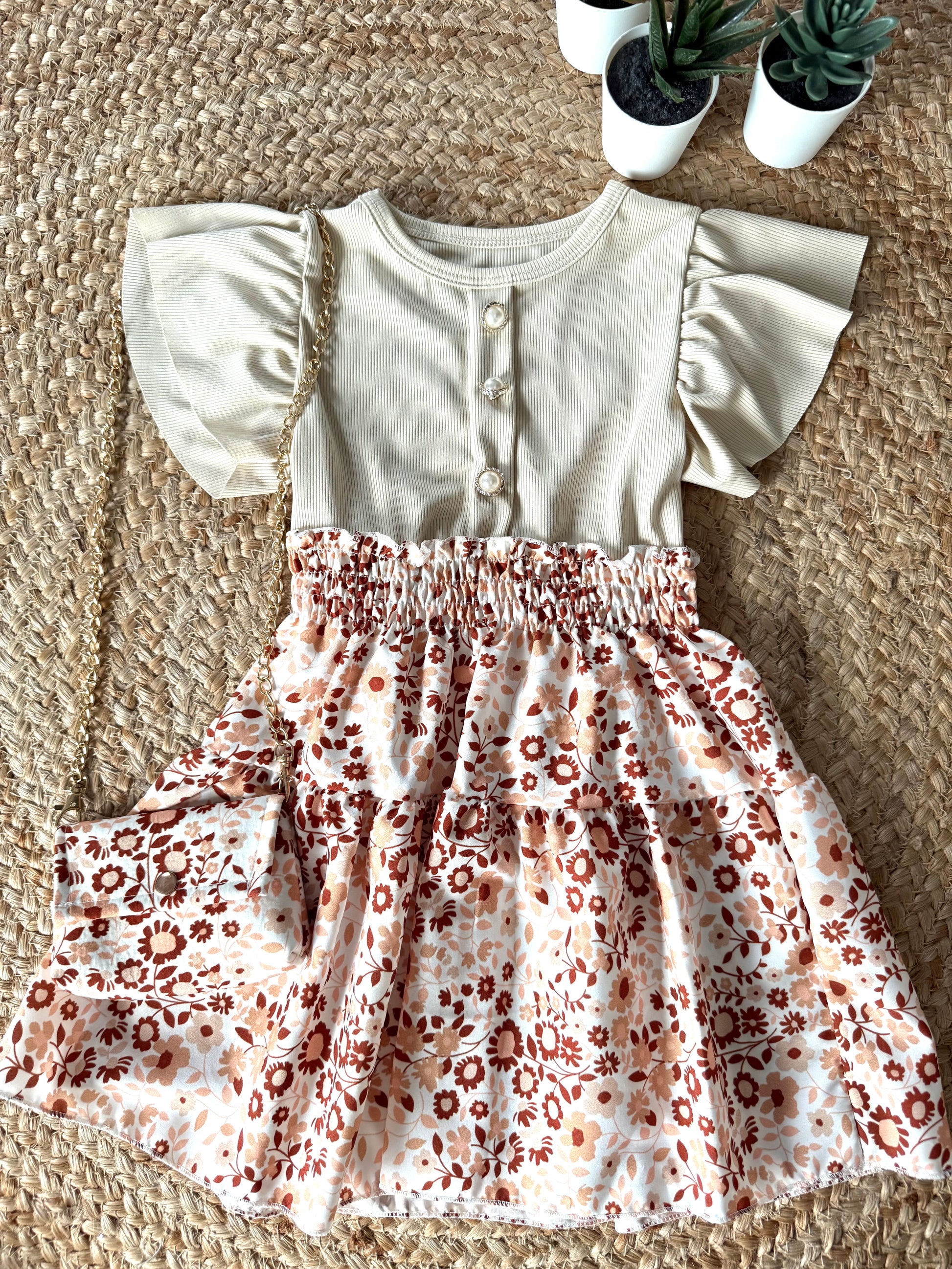 Détails : Robe élégante à matière côtelée sur le haut, ornée de boutons perles décoratifs. Le bas est délicatement fleurie, apportant légèreté et féminité. Livrée avec un sac assorti pour un ensemble harmonieux et chic.
